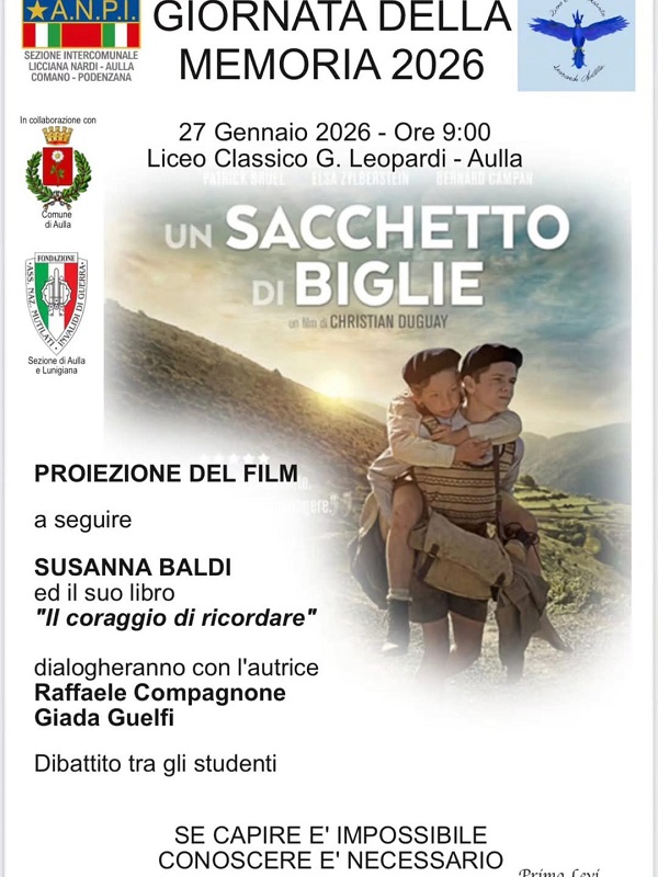 In occasione della ricorrenza internazionale della Giornata della Memoria, la città di Aulla si fa promotrice di una testimonianza tangibile volta a custodire la memoria e tradurla in un impegno civico vivo per le nuove generazioni. Con questo spirito di responsabilità, Martedì 27 Gennaio 2026 la comunità scolastica locale sarà protagonista di un articolato percorso di studio e riflessione. Alle ore 9, si apriranno le porte del Liceo Classico di Aulla per una giornata di studio e riflessione costruita a più mani. Dalla collaborazione tra gli studenti del Liceo Classico "G. Leopardi", l'Assessorato alla Cultura del Comune di Aulla, l'A.N.P.I. - Sezione Intercomunale Licciana Nardi - Aulla - Comano - Podenzana - e l'A.N.M.I.G. - Associazione Nazionale Mutilati e Invalidi di Guerra - Sezione di Aulla e Lunigiana -, avrà luogo un importante momento di incontro e formazione dedicato alle nuove generazioni. Il programma della mattinata prevede un approccio multimediale alla memoria storica, iniziando con la proiezione del film "Un sacchetto di biglie" - Un sac de billes -, opera diretta da Christian Duguay. Il film racconta la toccante storia vera di due fratelli ebrei nella Francia occupata dai nazisti, offrendo agli studenti uno spunto visivo ed emotivo potente sulle persecuzioni razziali. A seguire, l'attenzione si sposterà sulla testimonianza letteraria con l'intervento di Susanna Baldi, che presenterà il suo libro intitolato "Il coraggio di ricordare". A dialogare con l'autrice saranno Raffaele Compagnone e Giada Guelfi, che guideranno l'approfondimento sui temi trattati nel testo. La mattinata si concluderà con un dibattito aperto tra gli studenti, offrendo ai ragazzi l'opportunità di essere parte attiva della commemorazione, ponendo domande e condividendo riflessioni. L'iniziativa nasce dalla volontà di trasmettere ai più giovani il dovere della testimonianza, incarnando lo spirito della celebre frase di Primo Levi scelta dagli organizzatori come bussola morale della giornata: "Se capire è impossibile, conoscere è necessario". Un invito che ad Aulla, quest'anno, diventa azione collettiva. Nel contempo, nei locali dell'Istituto comprensivo Dante Alighieri di Aulla, gli alunni delle classi prime di scuola secondaria di primo grado parteciperanno alla presentazione del libro "Ciao, mi chiamo Bessy" una fiaba ispirata alla vita di Liliana Segre scritta dalla giornalista e scrittrice Angela Maria Fruzzetti. L'obiettivo è avvicinare i minori al difficile tema dell'olocausto. Gli eventi non sono stati concepiti come delle lezioni frontali ma, dunque, come un percorso partecipato dove scuola, amministrazione e custodi della memoria storica lavorano insieme per fornire ai ragazzi gli strumenti interpretativi del presente.