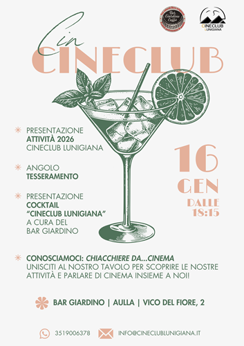 Venerdì 16 gennaio 2026, alle ore 18.15, il Cineclub Lunigiana inaugura ufficialmente il nuovo anno sociale con un evento aperto a tutti dal titolo “CinCineclub”, in programma presso il Bar Giardino di Aulla (Vico del Fiore 2). Si tratta di un appuntamento pensato non solo per gli associati, ma anche per curiosi, appassionati e per chi desidera avvicinarsi per la prima volta alle attività del Cineclub. Verrà presentato il calendario delle prime attività dell’anno in corso e si aprirà ufficialmente la nuova campagna di tesseramento per l’anno sociale 2026, con la possibilità di aderire direttamente in loco. Per l’occasione, il Bar Giardino presenterà il cocktail “Cineclub Lunigiana” proseguendo le collaborazioni creative avviate pochi mesi fa con il panino della Taverna Tortuga, che ci permettono di valorizzare le eccellenze del nostro territorio unendo cultura cinematografica e gusto. Gli ingredienti sono ancora misteriosi, e sarà una sorpresa anche per noi del Cineclub scoprire cosa ci ha dedicato lo storico locale aullese. Durante l’evento si svolgerà una chiacchierata aperta sul cinema, nello stile che contraddistingue il Cineclub Lunigiana: uno spazio libero di confronto, dove ogni partecipante può esprimere la propria opinione, condividere gusti, idee e riflessioni senza formalismi o barriere. “CinCineclub” rappresenta un momento simbolico di apertura e condivisione, un invito a vivere il cinema non solo come visione, ma come esperienza collettiva e occasione di incontro. Ingresso libero.