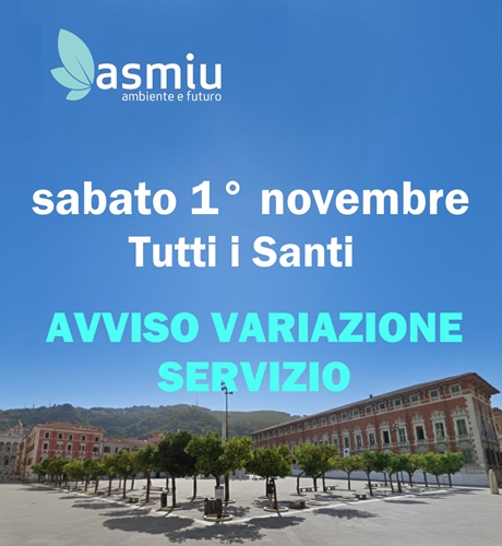 In occasione della Festa di Tutti i Santi, che si celebrerà sabato 1° novembre 2025, ASMIU S.p.A. informa che i servizi di raccolta rifiuti subiranno alcune variazioni. In particolare: la raccolta domiciliare per le utenze domestiche (famiglie) sarà regolare, ma si svolgerà solo al mattino, nella fascia oraria 7:00 – 13:00; la raccolta per le utenze non domestiche (attività commerciali) sarà sospesa, ad eccezione delle utenze della zona di costa, per le quali è previsto il consueto servizio mattutino; gli uffici ASMIU e la Ricicleria resteranno chiusi per l'intera giornata. Si raccomanda agli utenti di esporre i rifiuti la sera precedente o entro le ore 6:00 del giorno di raccolta, così da agevolare il corretto svolgimento delle operazioni. ASMIU ringrazia l'utenza per la consueta collaborazione.