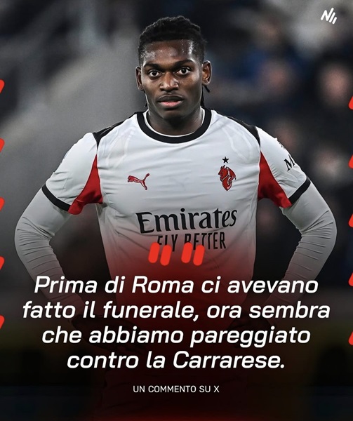 Difficile credere che l’attaccante del Milan Rafael Leao abbia fatto un post nel quale usa la Carrarese come parametro di pochezza calcistica in relazione al pareggio del Milan con la Roma di domenica 25 gennaio; assai più facile, invece, ritenere che l’escamotage con l’infelice paragone sia frutto delle menti che gestiscono la pagina Instagram di tifosi rossoneri Noi Milan: fatto sta che, a esserne spiacevolmente colpiti sono stati i tifosi della Carrarese che hanno già cominciato a fare le loro rimostranze social. Il post in questione, indicato come commento su X, un social che ha più diffusione all’estero che in Italia, riporta una foto di Leao con una frase che dice: “Prima di Roma ci avevano fatto il funerale, ora sembra che abbiamo pareggiato contro la Carrarese”. La puzza di fake è fin troppo asfissiante: di certo Leao non ha fatto un commento simile, resta però che la pagina Noi Milan ha usato e divulgato un fake nel quale viene sminuita la Carrarese e questo, decisamente, non è corretto nei confronti della società gialloazzurra, nei confronti dei suoi storici e incredibili tifosi e non è giusto neppure nei confronti del Milan perché mostra un aspetto dei suoi tifosi – il sottotitolo della pagina Instagram è “La casa del Milan e dei milanisti” – molto poco onorevole. Le scuse, a questo punto, sarebbero doverose.