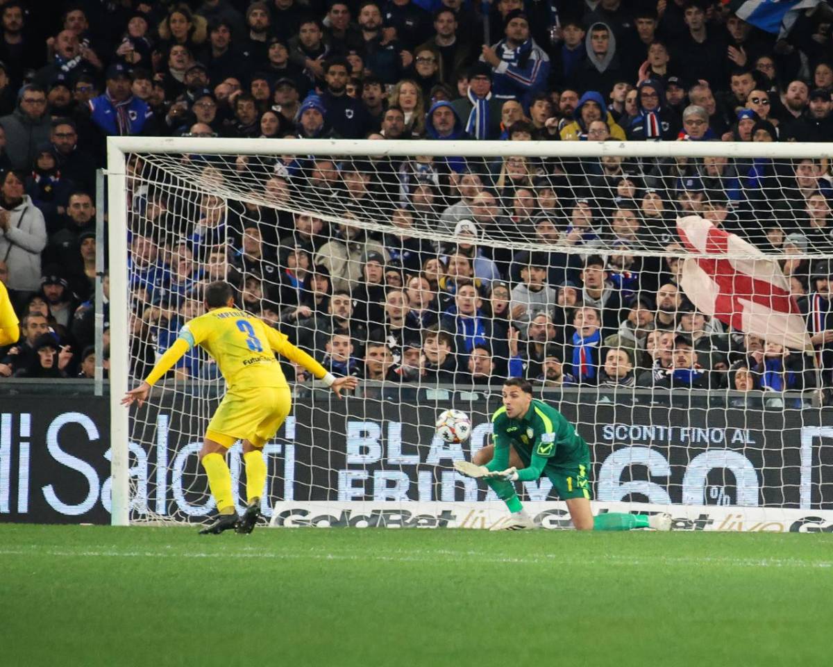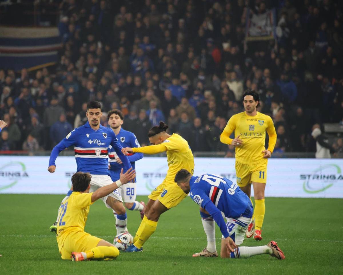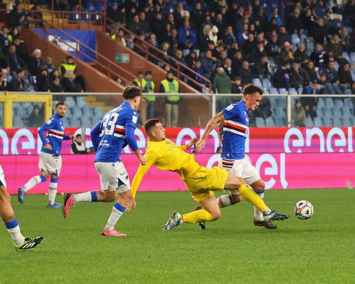 Sampdoria e Carrarese si affrontano nel turno numero 15 del campionato di serie B, entrambe alla ricerca di una svolta: blucerchiati reduci dalla sconfitta nel derby con lo Spezia, azzurri invece dalla pesantissima sconfitta per 5 a 0 a Palermo. Partono subito forte gli azzurri che al secondo minuto sfruttando una punizione batutta velocemente da Schiavi, Finotto imbuca per Abiuso che di sinistro al volo segna l'1 a 0 per la Carrarese. Al 5' la tifoseria di casa lancia un fumogeno in campo e il gioco viene interrotto per un paio di minuti. Al 10' la Samp inzia a farsi vedere dalle parti di Bleve con Pafundi, ma il suo tiro a rientrare termina fuori. Al 17' la Samp pareggia su corner, Coda gira sul primo palo e trova la rete, con Bleve poco reattivo sul colpo di testa dell'attaccante. Al 25' azione avvolgente della Carrarese, Zuelli allarga per Zanon che crossa e Abiuso stacca di testa e firma la doppietta per portare nuovamente avanti gli azzurri. Al 30', nuovamente, su corner per i blucerchiati avviene un check var per presunto fallo di mano dello stesso Abiuso, ma dalla sala var non arriva nessun richiamo per l'arbitro Sozza che comanda la ripresa del gioco. Al 35' altro ribaltone: Henderson riceve da 35 metri e spara un missile che finisce al 7 alle spalle di Bleve, 2 a 2 e parità ristabilita.