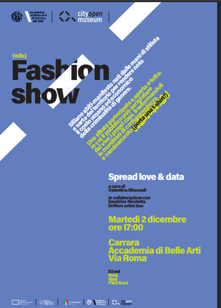 "Edu Fashion Show-Spread Love & Data" : arte, moda e impegno civile per raccontare il costo umano ed economico della violenza di genere. L'accademia delle Belle Arti il 2 dicembre 2025 a Carrara in via Roma dalle ore 17:00 presenta "Edu Fashion Show-Spread Love & Data" una sfilata che unisce moda arte e impegno civile. Il progetto, ideato dal duo artistico "Drifters" formato da Valentina Miorandi e Sandrine Nicoletta, nasce con la volontà di mettere in evidenza l'impatto umano ed economico della criminalità e della violenza di genere in Italia, un fenomeno che secondo fonti Istat comporta un costo stimato di miliardi di 98,78 euro l'anno. La moda in questo progetto culturale della città, si fa manifesto con una sfilata che vuole trasformare i dati in consapevolezza. L'iniziativa rientra nel progetto PNRR City Open Museum volto alla valorizzazione culturale e alla costruzione di nuovi spazi di relazione tra arte, cittadinanza e territorio. "Edu Fashion Show-Spread Love & Data" trae ispirazione dal saggio "Il costo della virilità" di Ginevra Bersani Franceschetti e Lucile Peytavin che indaga l'impatto sociale ed economico della criminalità e della violenza di genere offrendo una base critica che il progetto rielabora attraverso linguaggi visivi, moda e performance. Il 2 dicembre a Carrara, in via Roma, infatti stilisti e sarti del territorio presenteranno creazioni originali pensati come veri e propri manifesti indossabili. Ogni capo di abbigliamento sarà serigrafato con dati, percentuali ed informazioni provenienti dalle fonti Istat, trasformando così l'atto del vestirsi in una pubblica dichiarazione di consapevolezza sociale. Durante l'evento, che è aperto a tutta la cittadinanza e completamente gratuito, il pubblico potrà partecipare attivamente all'iniziativa stessa serigrafando dal vivo un proprio indumento, personalizzandolo con grafiche e messaggi del progetto, creando così un momento collettivo di arte, educazione e socializzazione. Nei giorni successivi all'evento le grafiche e i capi realizzati resteranno esposti come testimonianza pubblica e condivisa del progetto. L'accademia delle Belle Arti di Carrara accoglie questa iniziativa come parte integrante del percorso City Open Museum che punta a creare una rete diffusa di pratiche artistiche e formative nella città. "Edu Fashion Show-Spread Love & Data è un esempio concreto di come l'arte possa dialogare con il presente e trasformarsi in uno strumento di consapevolezza, educazione e responsabilità civile. L'accademia è orgogliosa di sostenere un progetto che unisce creatività ricerca e partecipazione attiva della comunità. Iniziative come questa dimostrano la capacità dei nostri studenti, docenti e dei professionisti del territorio di utilizzare i linguaggi visivi per generare riflessione e valorizzare il tessuto sociale della città. È un percorso che incarna pienamente la missione del City Open Museum: portare l'arte fuori dalle aule nelle strade e tra le persone" ha dichiarato Marco Baudinelli direttore dell'accademia delle Belle Arti di Carrara.