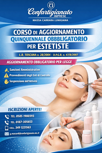 Confartigianato Imprese Massa Carrara Lunigiana informa che sono aperte le iscrizioni al corso di aggiornamento quinquennale obbligatorio per estetiste, previsto dalla L.R. Toscana n. 28/2004 e dal Regolamento di attuazione D.P.G.R. n. 47/R/2007.L’aggiornamento professionale è obbligatorio per legge: la mancata frequenza può comportare sanzioni amministrative e provvedimenti da parte degli enti di controllo, fino alla sospensione dell’attività in caso di irregolarità accertate. Il corso consente di: mantenersi in regola con gli obblighi normativi, aggiornare le competenze tecniche e professionali ed approfondire aspetti igienico-sanitari e novità del settore. Le lezioni si svolgeranno presso le sedi di Confartigianato Imprese Massa Carrara Lunigiana.