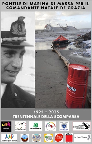 Nella provincia di Massa Carrara, nello straordinario e suggestivo scenario delle Apuane: porto, cave e rifiuti tossici. Come se non fossero bastati Farmoplant, inceneritore ed interramento di rifiuti tossici, siti contaminati di interesse nazionale e regionale (SIN e SIR), inquinamenti, mancate bonifiche, contaminazione di fiumi, sorgenti e falde acquifere, tumori e leucemie, erosione degli arenili, consumo di suolo, distruzione di ecosistemi. Protagonisti in positivo e vittime inconsapevoli: cittadini, malati di tumori, giornalisti, ambientalisti, magistrati e degni servitori dello Stato come il capitano Natale De Grazia, simbolo della lotta contro la criminalità organizzata e le illegalità.Il 13 dicembre 2025, nella ricorrenza del trentesimo anniversario della misteriosa e tragica scomparsa del Comandante De Grazia, l’Associazione “Alberto Benetti APS” rinnova formalmente la richiesta già presentata al Comune di Massa nel dicembre 2024, per l’intitolazione del Pontile di Marina di Massa al Capitano di Fregata Natale De Grazia.Nell’interesse della cittadinanza e degli operatori economici, si spera che l’imminente rimozione del cargo Guang Rong, spiaggiatosi sulla costa apuana il 28 gennaio 2025 dopo aver parzialmente distrutto il pontile di Marina di Massa, e l’auspicato rapido ripristino strutturale ed estetico del pontile siano la concreta premessa per la rapida valutazione e favorevole accettazione da parte dell’Amministrazione Comunale della proposta di intitolazione del Pontile di Marina di Massa al Comandante Natale De Grazia. Noi tutti siamo in eterno debito con lui.