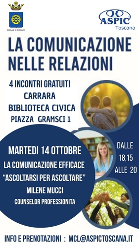 Aspic Toscana, Scuola Europea di Counseling professionale, prima scuola di Counseling nata in Italia nel 1988, torna a Carrara anche quest'anno con tre appuntamenti gratuiti e aperti a tutti per confrontarsi sui temi della comunicazione e della crescita personale . Un legame ormai consolidato da anni con la nostra provincia e con Carrara, attraverso le referenti locali della sede centrale di Firenze, e su temi che mai come in questo momento storico sono importanti come il miglioramento della qualità , umana e professionale, delle nostre relazioni .Aspic , presente sul territorio nazionale con 40 sedi che sviluppano attività ricerca, formazione e progetti di applicazione nel counseling , coaching e mediazione familiare, riconferma quindi anche quest'anno il rapporto con la Città con 3 nuovi appuntamenti a Carrara e uno in Lunigiana c/o il Centro Icaro di Licciana Nardi .Gli incontri gratuiti e aperti a tutti porteranno la riflessione sulla efficacia e l'importanza degli strumenti di counseling, quali la comunicazione assertiva e l'ascolto attivo, nelle relazioni umane in generale per arrivare poi, più specificatamente, all'ambito familiare e scolastico. Tre le date degli incontri che si svolgeranno di martedì, dalle 18 alle 20 presso la Sala Gestri della Biblioteca Comunale di Carrara in Piazza Gramsci 1 ciascuno condotto a cura di counselor professioniste di Aspic Toscana.Si inizierà a Carrara il 14 ottobre alle h 18 con " La Comunicazione Efficace . Ascoltarsi per Ascoltare " a cura di Milene Mucci per proseguire il 21 Ottobre con "Ascoltami anche se sono in silenzio. Comunicazione empatica per genitori che vogliono capire i propri figli e se stessi " a cura di Ivana Elia e il 28 Ottobre con l'incontro "Parole che costruiscono ponti .Una comunicazione efficace per migliorare le relazioni scolastiche "condotto da Cristina Giuntoli e Claudia Brunotti . Per la Lunigiana c/o il Centro Icaro di Costamala sarà ripetuto il 16 ottobre alle 18 l'incontro sulla Comunicazione empatica per genitori a cura di Ivana Elia .Gli incontri in Sala Gestri hanno avuto il Patrocinio del Comune di Carrara .Un percorso interessante ed una importante opportunità di crescita personale e professionale che Aspic con i suoi professionisti offre alla cittadinanza dedicato a chi è interessato a conoscere e migliorare le proprie modalità di essere e comunicare all'interno di relazioni sia personali che professionali oltre che un impegno importante oggi anche livello sociale nella consapevolezza che comunicare meglio e relazionarsi meglio getta sicuramente le basi per lo stare insieme in una società migliore, piu vivibile, inclusiva e coesa di cui , mai come oggi, c'è estremamente bisogno.
