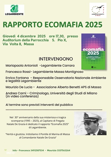 L’Associazione “Alberto Benetti APS” di Massa e Legambiente hanno in programma giovedì 4 dicembre 2025 dalle ore 17:30 presso l’Auditorium della Chiesa San Pio X (Via Volta, 8 – Massa) la realizzazione di un evento pubblico per la presentazione del Rapporto “Ecomafia 2025” di Legambiente e per ricordare, nel trentennale della sua misteriosa ed tragica scomparsa, la figura del Comandante Natale De Grazia al quale è dedicato il suddetto rapporto e per il quale è stata formalmente richiesta il 13 dicembre 2024 l’intitolazione del Pontile di Marina di Massa Tra gli altri, è prevista, la partecipazione di Enrico Fontana, Responsabile dell’Osservatorio Nazionale Ambiente e Legalità di Legambiente, e in videoconferenza di Andrea Carnì, criminologo assegnista di ricerca presso l’Università degli Studi di Milano.