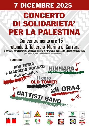 Il gruppo massese GazaFuoriFuoco continua la sua battaglia contro Israele, a favore della Palestina e organizza un'altra manifestazione, un concerto e una raccolta fondi: "Di fronte al genocidio che sta avvenendo a Gaza, all’occupazione senza sosta in corso in Cisgiordania e alla destabilizzazione di tutta l’area del Medio Oriente, è sempre più necessario non abbassare lo sguardo.Per questo come Gaza Fuorifuoco, insieme ad altre associazioni e organizzazioni, invitiamo tutte e tutti a partecipare al concerto di solidarietà per la Palestina che si terrà il 7 dicembre a Marina di Carrara. Ci troveremo in concentramento alle ore 15:00 presso la rotonda G. Taliercio a Marina di Carrara, per un corteo lungo viale Vespucci.Il concerto si terrà successivamente in Largo Marinai d’Italia. Suoneranno per la Palestina: il duo acustico Riki Furia e Maurizio Bogazzi, il coro Old Tower, gli ORA4, la Battisti Band e i Kinnara.Durante l’evento sarà effettuata una raccolta fondi per il popolo palestinese.