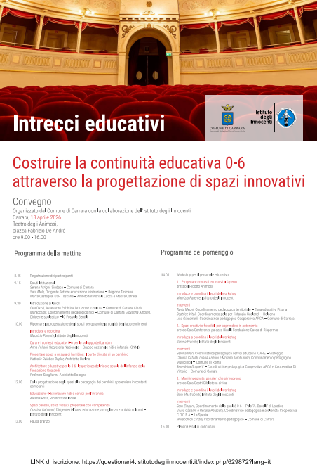 'Intrecci educativi. Costruire la continuità educativa 0-6 attraverso la progettazione di spazi innovativi' è il titolo del convegno organizzato dal Comune di Carrara con la collaborazione dell'Istituto degli Innocenti. L'appuntamento è per sabato 18 aprile, alle 9 al Teatro degli Animosi, in piazza Fabrizio De André a Carrara. L'iniziativa si inserisce nel quadro del dibattito nazionale sulla qualità dei servizi educativi per l'infanzia e rappresenta un'occasione di approfondimento sul tema della continuità educativa nella fascia 0-6 anni. Particolare attenzione sarà dedicata al ruolo degli spazi educativi, intesi come elementi attivi nei processi di apprendimento e sviluppo. Dopo i saluti istituzionali della sindaca Serena Arrighi e l'introduzione dei lavori da parte dell'assessore all'istruzione e cultura e Gea Dazzi, la parola passerà ai relatori con interventi dedicati al tema del convegno, in particolare su come ripensare la progettazione degli spazi per garantire la qualità degli apprendimenti.