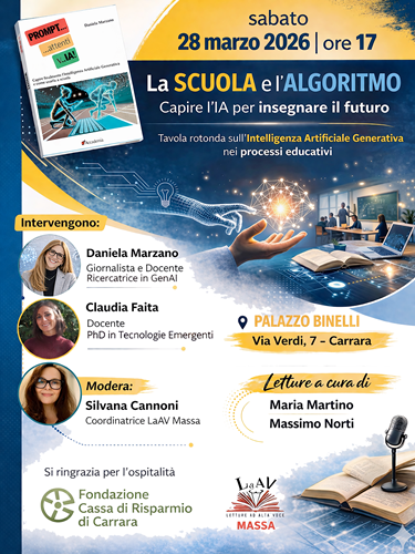 Un confronto aperto su scuola, innovazione e futuro dell’insegnamento, in un momento in cui l’Intelligenza Artificiale Generativa sta entrando con sempre maggiore forza nel dibattito educativo e culturale.È questo il cuore di “La scuola e l’algoritmo. Capire l’IA per insegnare il futuro”, la tavola rotonda in programma sabato 28 marzo 2026 alle ore 17,00 a Palazzo Binelli, in via Verdi 7 a Carrara.L’evento – che unisce divulgazione, approfondimento e confronto – è rivolto non soltanto agli addetti ai lavori, ma anche a docenti, famiglie, studenti e cittadini interessati a comprendere meglio i cambiamenti in corso. Verranno affrontate opportunità, criticità e prospettive dell’Intelligenza Artificiale Generativa nei processi di insegnamento-apprendimento con l’obiettivo di offrire al pubblico strumenti di comprensione e di applicabilità su una trasformazione che riguarda da vicino non solo il mondo della scuola e della formazione ma più in generale la società contemporanea.