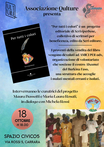 Sabato 18 ottobre alle ore 18.00, presso lo Spazio Civico5 in via Rossi 5 a Carrara, verrà presentato “Per tutti i colori”, il nuovo libro a scopo benefico scritto a più mani dal collettivo Scriviperbene, pubblicato da Seri Editore. Applicando i principi della cromoterapia, ogni racconto che compone la raccolta è accompagnato da una cornice colorata che guiderà la lettura in base al proprio stato d’animo. I racconti colorati parlano d’amore, amicizia, odio, passione, dolore, ognuno con la sua sfumatura. Nel libro si scoprono anche la storia, le curiosità e il ruolo del colore nella letteratura e nella filosofia.“Per tutti i colori” sostiene, con i proventi della vendita, l’associazione Amici Per ODV, che finanzia il centro Abasmei in Burkina Faso, una realtà di accoglienza e assistenza a persone affette da malattie mentali, spesso isolate e in difficoltà. Durante l’incontro presenteranno il libro le curatrici del progetto, Maura Bussotti e Maria Laura Rosati, in dialogo con Michela Rossi. Letture a cura di Annamaria Santucci e Manola Ceccarelli.L’iniziativa è gratuita e aperta a tutti, rappresenta un’occasione per condividere la lettura e sostenere un progetto che unisce creatività e impegno sociale.