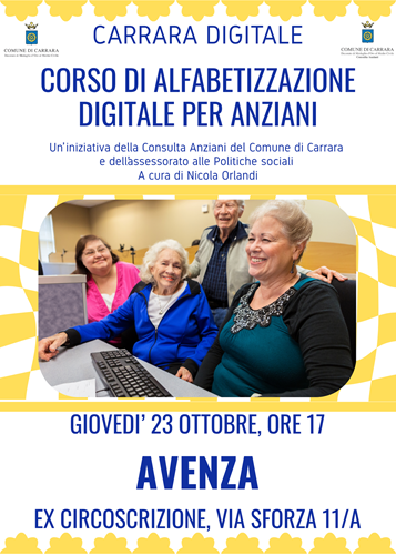 Giovedì 23 ottobre alle 17 alla delegazione comunale di Avenza, in via Sforza 11/A, si terrà il quinto incontro di 'Carrara Digitale'. Si tratta di un percorso di alfabetizzazione digitale organizzato dalla Consulta Anziani del comune di Carrara assieme all'assessorato alle Politiche sociali. Diversi i tempi che saranno affrontati durante l'incontro: dalla posta elettronica all'identità digitale fino all'accesso ai servizi delle pubbliche amministrazioni o ancora il saper utilizzare in maniera autonoma pc, tablet e altri dispositivi.A tenere le lezioni sarà Nicola Orlandi, facilitatore digitale con certificazione internazionale di alfabetizzazione digitale e ideatore della piattaforma per la facilitazione digitale Link start. A supporto di queste attività saranno inoltre disponibili le pillole informative di alfabetizzazione digitale 'Non è m@i troppo t@rdi' realizzate in collaborazione con Radio Elle Lunigiana.