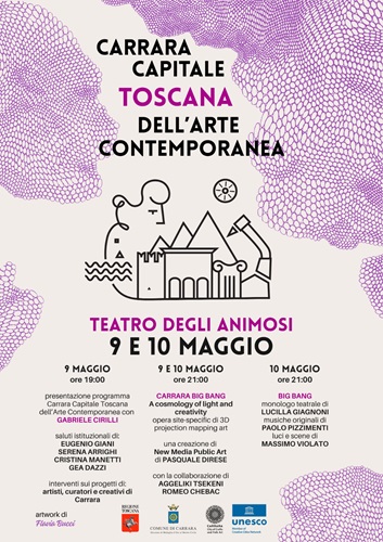 Sabato 9 e domenica 10 maggio il programma di Carrara Capitale toscana dell'arte contemporanea sarà presentato alla città. Il teatro degli Animosi sarà il cuore di una festa aperta a tutta la città pensata per raccontare le tante iniziative che animeranno Carrara nei prossimi mesi.«E' per noi un grande orgoglio essere la prima Capitale toscana dell'arte contemporanea – dice il sindaco Serena Arrighi -. Quando ci siamo candidati per il titolo nazionale abbiamo attivato sinergie che hanno portato alla nascita di progetti importanti. Il prossimo 9 e 10 maggio nel nostro teatro degli Animosi vogliamo festeggiare assieme a tutta la città questo riconoscimento presentando una parte delle tante iniziative che abbiamo in programma». «Quello di Capitale toscana dell'arte contemporanea è un importante riconoscimento per la città e il prossimo 9 e 10 maggio racconteremo tutto quello che andremo a fare – dice l'assessore alla Cultura Gea Dazzi -. Il nostro impegno per i prossimi mesi sarà quello di onorare nel migliore dei modi questo titolo e per questo stiamo programmando un calendario di eventi e iniziative di alto livello che si svolgeranno da maggio a dicembre nella cornice unica del nostro territorio». La grande festa di Carrara Capitale toscana dell'arte contemporanea si aprirà sabato 9 maggio alle 19 agli Animosi. A condurre la serata sarà il comico Gabriele Cirilli che introdurrà una ricca platea di ospiti che entreranno nel dettaglio del programma. Dopo i saluti istituzionali del presidente della Regione Toscana Eugenio Giani e del sindaco di Carrara Serena Arrighi, interverranno l'assessore regionale alla Cultura e pari opportunità Cristina Manetti e l'assessore comunale Gea Dazzi. Sarà poi la volta di curatori, direttori artistici, artisti e creativi di salire sul palco per illustrare il programma, tra cui la direttrice del Quotidiano Nazionale Agnese Pini, Stefano Pezzato responsabile collezioni e archivi e coordinamento attività regionali del Museo Pecci di Prato e tanti altri. A chiudere la prima serata sarà Pasquale Direse, artista e professore dell'Accademia di Belle Arti di Carrara che, alle 21, accenderà la facciata degli Animosi con 'Carrara Big Bang. A Cosmology of Light and Creativity' un'opera di videomapping art pensata proprio per Carrara Capitale toscana dell'arte contemporanea che resterà allestita per due giorni. Direse, con la collaborazione di Aggeliki Tsekeni e Romeo Chebac, darà vita a un'opera di 3D projection mapping art appositamente concepita per la facciata dello storico Teatro degli Animosi. L'opera immagina e interpreta l'architettura inerte come epidermide viva e dinamica, tela narrativa che si trasforma in mondo cosmico attraversato dalla luce, origine stessa del mondo. L'architettura del teatro non è semplice supporto, ma superficie viva e spazio di una trasformazione percettiva. Diviene un'opera visuale e sonora appositamente concepita e disegnata attraverso l'autenticità e l'originalità dell'arte pubblica mediata dalle tecnologie emergenti. Il progetto mette in relazione luce, immagine, suono e lo spazio pubblico di piazza De André in una scrittura polimediale capace di attivare nuove visioni e percezioni, inedite tracce della memoria della città.