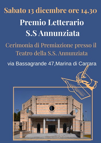 Cresce l’attesa per la Cerimonia di Premiazione del Premio Letterario S.S. Annunziata, in programma questo sabato, 13 dicembre, dalle ore 14:30, presso il Teatro della S.S. Annunziata di Marina di Carrara, Via Bassagrande 47. Fortemente voluto dal Gruppo Cultura del Consiglio Pastorale S.S. Annunziata di Bassagrande, il Concorso ha avuto un’ampia adesione, raccogliendo la partecipazione di moltissimi poeti, rappresentativi di più regioni italiane. Quattro le sezioni del Premio: Poesia a tema libero in lingua italiana; Poesia religiosa; Poesia in vernacolo; Poesia religiosa a tema “Il Natale” per i ragazzi delle scuole dell’obbligo. Soddisfatta, per l’alta qualità delle opere giunte a concorso, la Giuria, presieduta da Marina Pratici e composta da Don Andrea Forni; Don Cesare Benedetti; Francesca Tolaini; Franca Maria Danieli e Maria Adelaide Petrillo. La Cerimonia di sabato, negli ambiti della quale sarà svelato il nome degli autori vincitori, vedrà la presenza delle massime Autorità religiose e istituzionali del Territorio e di noti esponenti della cultura e dell’associazionismo locale. Non mancheranno preziosi intermezzi musicali e un augurale momento di convivialità in chiusura di giornata.