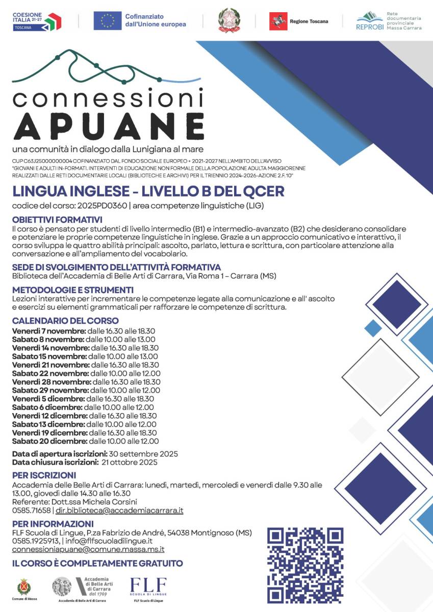 C'è ancora tempo per iscriversi, fino al raggiungimento del numero massimo di quindici partecipanti, al corso di Lingua Inglese - Livello B del QCER, che inizierà il 7 novembre alle 16:30 nella Biblioteca dell'Accademia di Belle Arti di Carrara di via Roma, 1 a Carrara. Interamente gratuito perché finanziato dal Fondo sociale europeo+ 2021-2027 nell'ambito del progetto "Connessioni Apuane", il corso è pensato per studenti di livello intermedio (B1) e intermedio-avanzato (B2) e consentirà ai partecipanti di consolidare e potenziare le proprie competenze in ascolto, parlato, lettura e scrittura.Le lezioni si svolgeranno ogni venerdì dalle 16:30 alle 18:30 e ogni sabato dalle 10:00 alle 13:00, fino al 20 dicembre, per un totale di trenta ore di lezione. La docente, Stephanie Craddock, imposterà le lezioni utilizzando un approccio comunicativo, ponendo particolare attenzione alla conversazione e con l'obiettivo di ampliare il vocabolario dei corsisti.Per iscriversi è necessario possedere il requisito della residenza e/o domicilio nella provincia di Massa-Carrara, scaricare la modulistica dalla pagina della Biblioteca del sito web dell'Accademia di Belle Arti di Carrara: https://accademiacarrara.it/biblioteca/ e inviarla alla Direttrice della Biblioteca dott.ssa Michela Corsini all'indirizzo di posta elettronica ordinaria:
