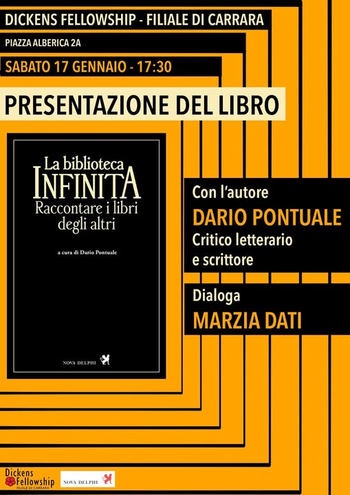 Sabato 17 gennaio alle ore 17,30 nuovo appuntamento alla Dickens Fellowship in Piazza Alberica 2/a a Carrara con la presentazione dell’antologia "La Biblioteca Infinita. Raccontare i libri degli altri" - Nova Delphi 2024 - a cura dello scrittore e critico letterario Dario Pontuale. Un progetto letterario unico nel suo genere che “offre una collazione di testi dalla quale affiorano alcune analogie”, come spiega lo stesso Pontuale nella sua Prefazione al libro. Sono trentuno i saggi editi, “firmati da venti grandi autori, dedicati a ventiquattro celebri scrittori, presi da cinque differenti lingue e decifrati da diciotto illustri traduttori” e che ricreano nel nostro immaginario i “secolari scaffali di Borges”.