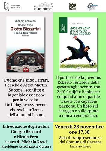 In vista di dicembre e delle sue festività, per gli amanti dello sport e delle buone letture, venerdì 28 novembre, alle ore 17:30, nella sala di rappresentanza del Comune di Carrara si terrà una doppia presentazione a cura dell’Associazione Qulture. Ecco il duetto di romanzi che potremmo definire della nostra memoria: il primo, scritto da Giorgio Bernard e Nicola Pera, si intitola “Giotto Bizzarrini, il genio della velocità” (GM libri, 2025) e ci narra dei tanti successi e delle sconfitte brucianti di un uomo che ha attraversato rombando gli anni del boom economico, percorrendoli alla guida di un bolide vincente, invidiato e temuto dai suoi molti rivali. Una vita dominata dalla passione per la velocità, sempre rincorrendo la vittoria e la perfezione meccanica, affrontando i rischi spietati delle corse automobilistiche, sfidando i colossi del suo tempo: Ferrari, Aston Martin, Porsche a Le Mans, sul rettilineo infernale dell’Hunaudières o sotto il sole implacabile di Sebring, fino a lasciare un segno indelebile nella storia dell’automobile. Un romanzo scritto come un’indagine, attraverso le voci di alcuni testimoni che con lui hanno condiviso scelte, trionfi e dolori, in un viaggio lungo più di cinquant’anni, dai ruggenti Sessanta fino ai nostri più prosastici giorni. La mentalità innovativa di un uomo che collaborò con Ferrari, Lamborghini e molti altri, dal carattere schietto e spigoloso, ma sempre capace di sorprendere e di cambiare le regole del gioco coi suoi geniali progetti.