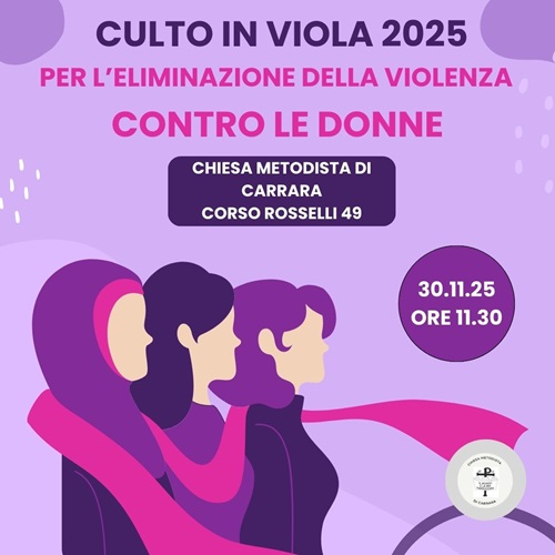 Per dare continuità all'impegno e per offrire uno spazio di riflessione e sensibilizzazione aperto a tutta la città, la Chiesa Metodista di Carrara invita la cittadinanza a partecipare al Culto in Viola, domenica 30 novembre alle 11:30 nella Chiesa Metodista di Carrara, Corso Rosselli 49. Il culto, che sarà interamente curato e condotto dalle donne della comunità metodista, vedrà la partecipazione di:Autorità cittadine, ospiti e rappresentanti di associazioni ed enti attivi sul territorio di Carrara per la prevenzione della violenza di genere, esponenti di case rifugio per donne che hanno subito violenza. Sarà un momento di preghiera e solidarietà, ma anche un'occasione di confronto per tessere insieme una rete di protezione e supporto.