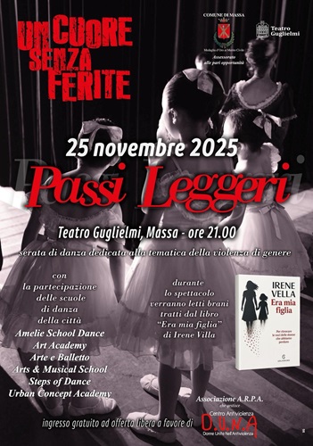 Martedì 25 novembre alle ore 21.00 presso il Teatro Guglielmi si svolgerà uno spettacolo organizzato in collaborazione con le scuole di danza classica, contemporanea e hip hop del territorio: Amelie School Dance, Art Academy, Arte e Balletto, Arts & Musical School, Steps of Dance e Urban Concept Academy. Le esibizioni saranno intervallate dalla lettura di brevi brani che trattano la tematica. Si tratta di una serata a scopo benefico: l’ingresso è ad offerta libera ed il ricavato andrà in favore dell’Associazione A.R.PA che gestisce il Centro Antiviolenza territoriale D.U.N.A.