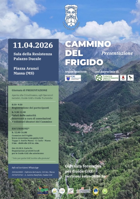 Il Cammino del Frigido si presenta al territorio ma soprattutto agli operatori turistici e alle guide escursionistiche con un'iniziativa di approfondimento e confronto in programma sabato 11 aprile nella Sala della Resistenza di Palazzo Ducale. Un evento che ha il patrocinio del Comune di Massa, del Parco delle Alpi Apuane e della Fondazione Cassa di Risparmio di Carrara che conferma il proprio impegno nella nascita e nello sviluppo dei cammini del territorio. Il progetto del Cammino del Frigido, così come prima quello di Aronte a Carrara, nato dal lavoro congiunto di associazioni, volontari e realtà escursionistiche locali, rappresenta un nuovo tassello nella costruzione di una rete di percorsi che unisce tutela ambientale, identità storica e fruizione sostenibile delle Apuane.