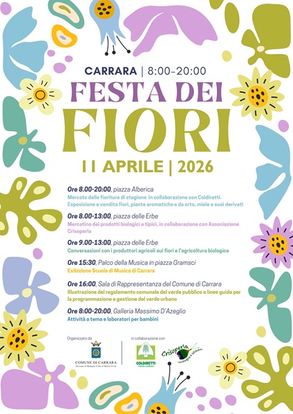 Protagonisti i fiori in tante variopinte e profumate declinazioni, ma ci sarà spazio anche per i prodotti biologici e tipici, miele, piante aromatiche e da orto: è tutto pronto a Carrara per l'edizione 2026 della Festa dei Fiori, organizzata dal Comune dalle 8 alle 20 in piazza Alberica, piazza delle Erbe e piazza Gramsci, in collaborazione con Coldiretti Massa-Carrara e l'associazione Crisoperla. Per tutto il giorno in piazza Alberica sarà possibile ammirare il mercato delle fioriture di stagione allestito da Coldiretti, con esposizione e vendita di fiori, piante aromatiche e da orto, miele e i suoi derivati.«Un centro colorato, un centro pieno di vita. La Festa dei Fiori è un appuntamento a cui teniamo molto e che celebra di fatto l'arrivo della bella stagione in città – dice l'assessore al Commercio Gianmaria Nardi -. Per tutto il giorno non ci saranno solo tante bancarelle con fiori e piante, ma anche approfondimenti sui prodotti del nostro territorio, la musica con gli allievi della scuola comunale e tanto altri ancora. Nel pomeriggio, inoltre, avremo l'occasione di presentare il nuovo regolamento del Verde pubblico e privato che è da poco stato approvato dal consiglio comunale e che ha al suo interno le linee guida per la progettazione e gestione del verde urbano». «Con l'arrivo della primavera speriamo che questa Festa dei Fiori possa regalare un sorriso a carrarini e visitatori – aggiunge la consigliera comunale Letizia Carusi -. In questi anni abbiamo costruito una squadra importante che coinvolge associazioni e commercianti nella realizzazione di una festa condivisa che sono certa anche quest'anno sarà un successo. Ci tengo per questo a ringraziare fin d'ora le tantissime persone e i tanti professionisti che stanno dando il proprio contributo all'organizzazione».Sempre sabato 11 aprile, dalle 8 alle 13 piazza delle Erbe ospita il tradizionale mercato dei prodotti biologici e tipici in collaborazione con l'associazione Crisoperla e il GAS (Gruppo di Acquisto Solidale). Oltre ai produttori delle province di Massa-Carrara e della Spezia che propongono ortaggi, frutta di stagione, legumi, miele, vino, formaggi di mucca e capra, salumi, farine, confetture, succhi di frutta, in occasione della Festa dei Fiori parteciperanno anche alcuni produttori emiliani con speciali prelibatezze e golosità. Alle 11 invece nella galleria di via Roma, in collaborazione col bar Arlecchino è in programma la presentazione del libro 'Gli erbi della Versilia' e un laboratorio di fiori secchi mentre per tutto il giorno in piazza Mazzini ci sarà un'esposizione di auto storiche. Il pomeriggio, a partire dalle 15.30 e fino alle 17.30, sarà allietato dall'accompagnamento musicale: in piazza Gramsci, al palco della Musica è in programma l'esibizione delle allieve e degli allievi della Scuola comunale di Musica.