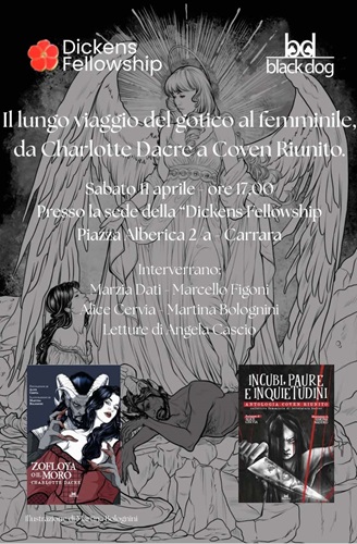 L’Antologia Incubi, paure e inquietudini, di Coven Riunito, (Black Dog Edizioni, 2025), contiene diciassette racconti scritti da altrettante autrici. Il tema comune a tutti i componimenti è “la paura nel quotidiano”. La raccolta spazia tra tutti i sottogeneri dell’horror, dallo splatter al thriller, dalle storie di mostri a quelle dalle atmosfere più oniriche. Tra queste pagine vi imbatterete in demoni assetati di sangue, assassine spietate, fenomeni inspiegabili e tanto, tanto orrore. Gli elementi tipici della letteratura di genere sono utilizzati come metafora della realtà e addentrandovi tra le oscure pagine che compongono questo volume vi imbatterete in tematiche di stretta attualità e di grande importanza sociale. Il collettivo Coven Riunito dimostra ancora una volta, sempre se ce ne fosse ancora bisogno, quanto le voci femminili siano e siano sempre state importanti nello sviluppo della narrativa di genere.Interverranno Marzia Dati, Presidente della Dickens Fellowship Carrara Branch, che aprirà i lavori contestualizzando il periodo storico in cui ha operato Dacre, seguirà Marcello Figoni, responsabile editoriale di Black Dog, illustrerà la visione della casa editrice, focalizzata sul legame indissolubile tra le radici del gotico e la sensibilità moderna. Interverrà Martina Bolognini, illustratrice dell'edizione Black Dog di Zofloya, racconterà il processo creativo per dare volto e forma alle atmosfere cupe e seducenti del romanzo; Alice Cervia, autrice, interverrà per presentare l'antologia Incubi, paure e inquietudini, opera del collettivo tutto al femminile Coven Riunito, dimostrando come le tematiche care alla Dacre vibrino ancora nella narrativa horror attuale. L’appuntamento, aperto a tutti, rappresenta un’occasione imperdibile per gli appassionati di letteratura, per chi ama il genere horror e per chi vuole approfondire un capitolo fondamentale, e spesso trascurato, della storia della scrittura femminile