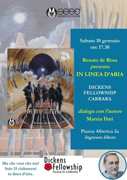 Sabato 10 gennaio alle ore 17:30 riprendono gli appuntamenti letterari alla Dickens Fellowship in Piazza Alberica 2/a. Ad aprire l’anno 2026 è Renato de Rosa con il suo ultimo romanzo In Linea d’Aria (SEED – Selvatiche Edizioni, 2025), presenta la Presidente della Dickens Fellowship Marzia Dati. L’autore, già ospite della Dickens, ha all’attivo vari romanzi. Laureato in matematica, è presidente di una società di consulenza alle imprese sulle politiche comunitarie. Esperto di creatività, ha ideato e insegna Free Mind, una tecnica innovativa per potenziare l’attitudine a pensare con la propria testa. È autore di giochi da tavolo pubblicati in Italia e all’estero, categoria nazionale di scacchi e di bridge e socio del Mensa, l’associazione mondiale delle persone con elevato Q.I. Ha inoltre collaborato come autore e attore con i laboratori di Zelig. Nel 2006 ha pubblicato Il più grande calciatore del mondo, (Ed. Limina, premio Coni Ussi per il romanzo sportivo), nel 2012 La variante del pollo (Ed. Mursia) una raccolta di parodie dei maggiori scrittori italiani sul tema “Perché il pollo ha attraversato la strada?” e nel 2016, sempre per Mursia, il sequel La variante del pollo international, con le parodie dei grandi autori stranieri. Nel luglio 2020 ha scritto, per Carbonio Editore, Osvaldo, L’Algoritmo di Dio, un romanzo ironico e profetico sull’intelligenza artificiale. Nel 2021 pubblica per l’editore Photo Travel, Figli d’arte, la storia dei suoi antenati, per secoli attori di teatro itinerante.