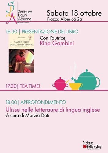 Sabato 18 ottobre a partire dalle ore 16:30 alla Dickens Fellowship in Piazza Alberica 2/a a Carrara la scrittrice Rina Gambini presenterà il suo libro Dante e Ulisse due uomini in viaggio e altre storie dantesche (2025) e Marzia Dati parlerà della ricezione di Ulisse nella letteratura inglese e dei paesi di lingua inglese, il tutto intervallato dall’Afternoon Tea. Un sabato pomeriggio all’insegna delle Letterature e in particolare del mito di Ulisse presso la Dickens Fellowship. Un evento che partirà alle 16:30 con la presentazione del volume Dante e Ulisse due uomini in viaggio e altre storie dantesche (2024 Ibiskos Ulivieri) a cura di Rina Gambini all’interno della rassegna Scritture Liguri Apuane ideata da Dickens Fellowship con l’obiettivo di far conoscere scrittori, poeti e saggisti del territorio che si estende da Montignoso fino alla Spezia e che include anche la Lunigiana. È il caso di Rina Gambini per la seconda volta ospite della Dickens. Rina Gambini, nata alla Spezia, ha vissuto a lungo a Milano, dove si è laureata in Filosofia all’Università Statale, con tesi in Filosofia della Storia. Residente alla Spezia, dopo alcuni anni dedicati all’insegnamento delle Materie Letterarie e delle Scienze Umane nelle scuole medie e superiori, ha iniziato a impegnarsi nella promozione della cultura e nella critica letteraria. Presidente e membro di giuria di numerosi e prestigiosi premi letterari, tra cui “Città di Salò” e “Via Francigena”, “Città di Pontremoli”, ne è stata anche organizzatrice. Promuove, inoltre, eventi culturali in numerose zone d’Italia. Ha tenuto conferenze tematiche su autori e argomenti inerenti la letteratura e la cultura in generale ed è presidente del Centro Culturale Il Porticciolo, oltre che ideatrice e curatrice della Rivista di informazione, approfondimenti e notizie di cultura, arte e società “Il Porticciolo”. Ha curato molte antologie letterarie, soprattutto poetiche e tematiche, allo scopo di diffondere e preservare la produzione letteraria contemporanea e stimolare l’interesse per la cultura tra le giovani generazioni. Sue numerose esegesi critiche e prefazioni a pubblicazioni di autori contemporanei. Come ha dichiarato l’autrice: “Ho voluto impostare questo libro, come è mia abitudine, per argomenti indipendenti, che pure si intersecano tra loro fino a dare una visione complessiva dell'uomo Dante e della sua opera. La scelta è dovuta al desiderio di non tediare mai il lettore offrendo anche al meno introdotto nel contesto letterario motivi di interesse e di piacevole lettura. In ultima analisi, una scelta di comunicazione più ampia, in cui credo da sempre. Gli argomenti dei vari saggi brevi, se possiamo così definirli, sono frutto di lungo studio e 'grande amore', per usare le parole del Poeta, sia della sua opera che di letture di illustri critici che se ne sono occupati. Tutto ciò mi ha consentito di tenere numerose conferenze sia di persona che on-line durante il periodo della pandemia, soprattutto per la Società Dante Alighieri di Casablanca (Marocco), per alcuni Comuni e per associazioni culturali. Queste conferenze, rivedute, ampliate e corrette ai fini di una lettura agevole e comprensibile, costituiscono la base per questa raccolta". Dopo la presentazione sarà offerto un English Tea ai presenti cui farà seguito un approfondimento sulla ricezione del mito di Ulisse nella letteratura inglese e dei paesi di lingua inglese a cura di Marzia Dati. L’incontro è aperto a tutti.