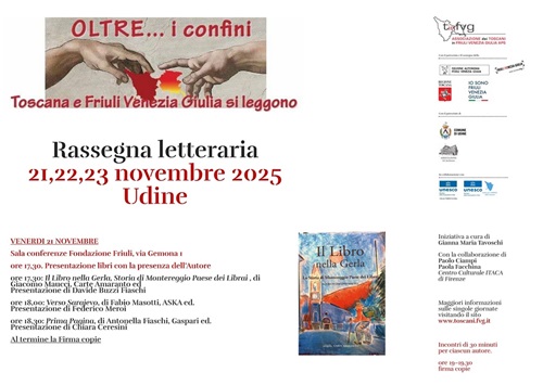 Sarà Il Libro nella Gerla. Storia di Montereggio il Paese dei Librai, pubblicato da CarteAmaranto, ad aprire la nuova rassegna letteraria "OLTRE... i confini. Toscana e Friuli Venezia Giulia si Leggono", manifestazione culturale promossa dall'Associazione dei Toscani in Friuli Venezia Giulia con il sostegno — tra gli altri — della Regione Toscana e della Regione Friuli Venezia Giulia, il patrocinio del Comune di Udine e la collaborazione dei Club per l'UNESCO di Udine e della Toscana. L'evento inaugurale si terrà venerdì 21 novembre alle ore 17.30, presso la Sala Conferenze della Fondazione Friuli, a Udine.La rassegna nasce con l'obiettivo di creare un ponte culturale tra due territori ricchi di storia, identità e tradizioni editoriali. Non è un caso che ad aprirla sia stato scelto proprio Il Libro nella Gerla, un'opera che racconta le radici profonde di Montereggio, il piccolo borgo della Lunigiana considerato unanimemente la culla del libro itinerante. Da queste montagne, infatti, partirono per secoli i celebri "librai ambulanti", figure divenute simbolo di intraprendenza culturale e di un modo unico di diffondere il sapere, contribuendo alla formazione di un paesaggio editoriale che ha segnato la storia del libro in Italia.Questa scelta assume un particolare valore simbolico: il volume rappresenta il mondo del libro in Toscana e, allo stesso tempo, il legame umano e storico che da Montereggio ha portato generazioni di librai a diffondere la lettura ben oltre i propri confini.A rafforzare questa eredità è la presenza dell'organizzatrice dell'intera rassegna, Gianna Maria Tavoschi, appartenente alla famiglia Tarantola di Montereggio, che nei primi del Novecento aprì importanti librerie a La Spezia e a Udine. Un filo genealogico e culturale che oggi ritorna e si rinnova proprio in questa manifestazione, dove la memoria dei librai ambulanti si intreccia con la storia del libro contemporaneo.L'incontro inaugurale offrirà un viaggio nella tradizione dei librai di Montereggio, nella loro epopea e nel contributo che hanno dato alla cultura italiana, segnando idealmente l'apertura di un percorso condiviso tra Toscana e Friuli Venezia Giulia sotto il segno dei libri e del dialogo tra territori
