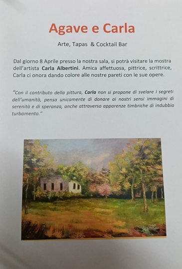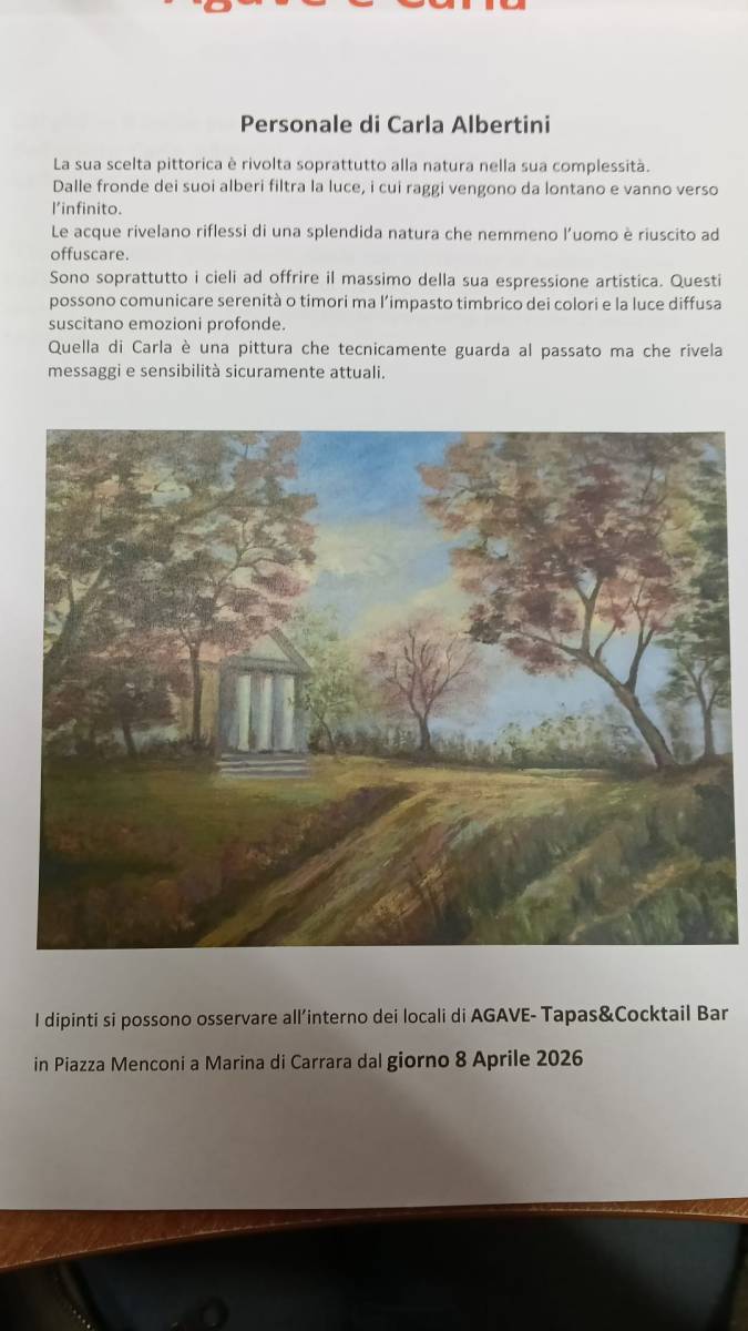 Agave Tapas e Cocktail Bar di Marina di Carrara ospiterà da mercoledì 8 aprile la mostra personale della pittrice e poetessa carrarese Carla Albertini. Una serie di dipinti ad olio dedicati a luoghi reali e a luoghi dell'anima, filtrati dalla naturale delicatezza di tocco e di sensibilità dell'autrice. I dipinti saranno accompagnati da testi scritti dalla stessa Albertini in collaborazione con il marito Pietro Marchini, anche lui scrittore e autore di poesie. Carla Albertini ha all'attivo diverse mostre, la partecipazione a vari reading e concorsi poetici e una raccolta di poesie dal titolo "Poesie al Tramonto", Diari Toscani editore. Per la rivista online Diari Toscani, sempre in collaborazione con il marito, cura una rubrica dedicata alle Voci del Territorio. "Con il contributo della pittura, Carla non si propone di svelare i segreti dell'umanità, pensa unicamente di donare ai nostri sensi immagini di serenità e speranza, anche attraverso apparenze timbriche di indubbio turbamento" è la recensione della mostra che appare sulla locandina dell'evento.