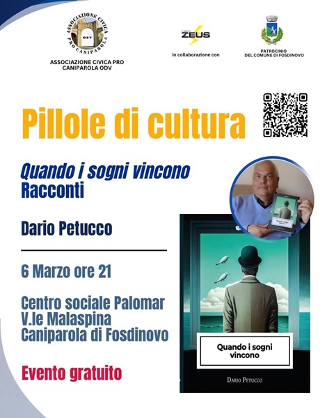 Nell'ambito degli eventi di cultura organizzati per l'anno 2026 dall'Associazione Civica Pro Caniparola OdV, il prossimo venerdì 6 marzo dalle ore 21 sarà la volta di Dario Petucco che parlerà del suo ultimo libro “Quando i sogni vincono”. Con lui dialogherà l'autrice Alice Cervia. La presentazione si terrà presso il Centro Sociale Palomar in Viale Malaspina a Caniparola di Fosdinovo, con ingresso libero a tutti. Questa antologia di racconti attraversa trame e registri narrativi differenti, alternando pagine introspettive e riflessive a episodi ironici e surreali; dalla cronaca di una ipotetica luna di miele al resoconto di un concerto rock, fino a un originale copione teatrale ambientato durante una cena tra amici. Non mancano incursioni in atmosfere più visionarie, con un testo onirico dedicato all’evoluzione degli organi umani, e racconti dai toni più audaci, uno pure con risvolti erotici. Sono comprese anche tre storie di genere giallo ispirate ai grandi classici anglosassoni: una di queste è ambientata all’interno della base navale della Spezia che qui diventa scenario di un mistero tutto da scoprire. Nei suoi scritti Dario Petucco intreccia la dimensione narrativa con quella personale e in un paio di racconti ci descrive la gioia di due suoi sogni che hanno vinto.