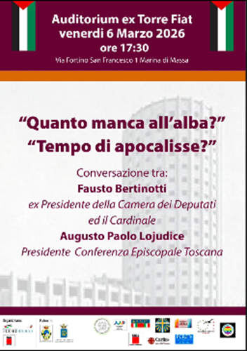"Quanto manca all'alba? Tempo di Apocalisse": incontro organizzato da GazaFuorifuoco con Fausto Bertinotti e il cardinale Augusto Paolo Lojudice alla Torre Fiat il 6 marzo