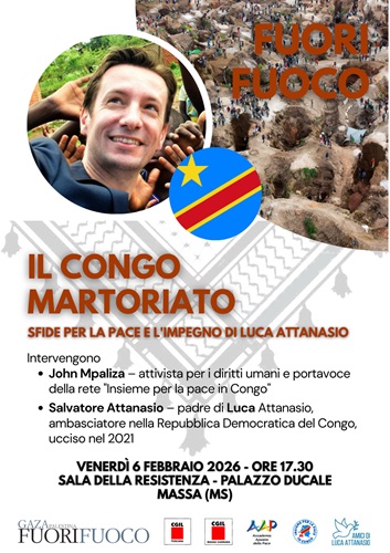 Per parlare della situazione del Congo, ma anche della figura di Luca Attanasio e del suo assassinio, su cui ancora rimangono inesplorati i veri mandanti, ne parleremo con i genitori di Luca e a John Mpaliza (portavoce della rete "Insieme per la Pace in Congo") venerdì 6 febbraio, alle ore 17.30, presso la Sala della Resistenza del Palazzo Ducale di Massa, anche per comprendere, nel dramma che si sta consumando in Congo e dall'insegnamento di Luca Attanasio, il ruolo che possiamo svolgere sia per contirbuire ad avviare un percorso di pace sia per insistere sulla necessità di istituire una Commissione d'Inchiesta che faccia luce veramente sulle cause dell'assassinio dell'ambasciatore.