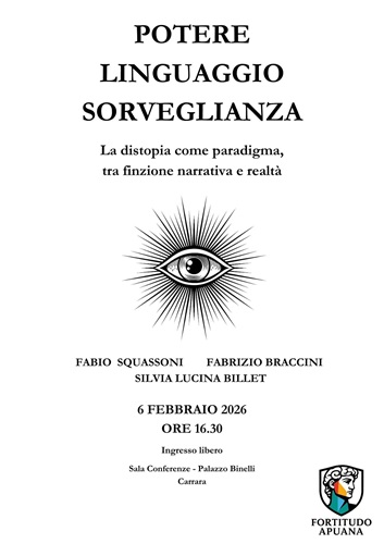 L’Associazione Fortitudo Apuana presenta un dibattito interdisciplinare per analizzare i confini tra la finzione narrativa e le dinamiche del controllo sociale moderno.Quanto della letteratura distopica del Novecento è diventato oggi realtà? È questa la domanda centrale dell’evento “Potere, Linguaggio, Sorveglianza”, che si terrà venerdi 6 febbraio alle ore 16:30 presso la Sala Conferenze di Palazzo Binelli a Carrara.L’incontro, organizzato da Fortitudo Apuana, si propone come analisi profonda sul paradigma distopico. Attraverso il confronto tra realtà e finzione, si esploreranno come le strutture di potere utilizzino il linguaggio e le nuove tecnologie per plasmare la società contemporanea.L’iniziativa nasce sulla scia dell’interesse riscontrato. L’Avvocato Fabio Squassoni e la Professoressa Silvia Lucina Billet, alla guida del progetto, esprimono grande soddisfazione per il percorso intrapreso: “Siamo davvero entusiasti di poter dibattere su questo tema. La partecipazione di pubblico registrata la volta precedente ci ha confermato quanto ci sia bisogno in città di spazi aperti di confronto critico e approfondito”.Al centro del dibattito ci sarà l’evoluzione del concetto di sorveglianza (dalle intuizioni orwelliane ai moderni algoritmi) e il ruolo del linguaggio come strumento di egemonia. L’evento invita a riflettere su quanto la profezia distopica sia ormai diventata un modello operativo del nostro quotidiano.