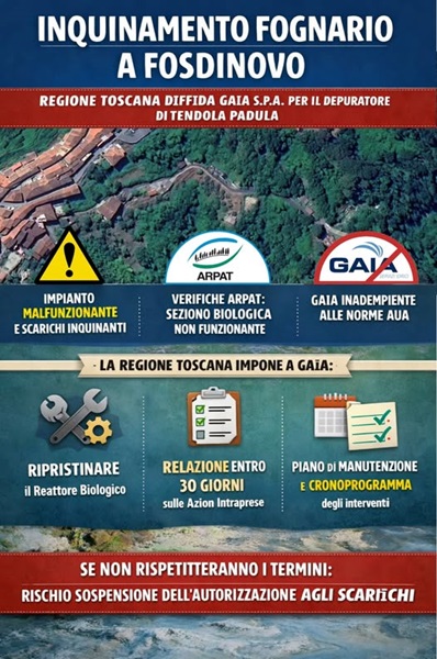 "Un'inerzia inaccettabile che pesa sull'ambiente e sulla salute dei cittadini". Con queste parole viene annunciata la presentazione di un'interrogazione consiliare urgente a seguito della pubblicazione del Decreto Dirigenziale n. 4660 del 10/03/2026 della Regione Toscana , che ha formalmente diffidato il gestore idrico GAIA S.p.A. per il grave malfunzionamento dell'impianto di depurazione "Tendola Padula".Dagli accertamenti condotti dal Nucleo Carabinieri Forestale di Massa e dai tecnici dell'ARPAT , è emerso che la sezione biologica del depuratore era totalmente fuori uso. Durante il sopralluogo del 24 febbraio 2026, i tecnici hanno rilevato che i "biodischi" (fondamentali per il trattamento dei reflui) erano fermi e i supporti plastici galleggiavano inerti nelle vasche, rendendo l'impianto incapace di depurare correttamente.Il dato più allarmante riguarda la tempistica: dai registri ufficiali dell'impianto è emerso che il guasto era stato segnalato già in data 22 agosto 2025. Nonostante la consapevolezza del danno, l'impianto è rimasto in attesa di manutenzione per circa sette mesi, provocando sversamenti non autorizzati nell'ambiente.L'interrogazione urgente depositata mira a ottenere risposte chiare dal Sindaco e dalla Giunta di Fosdinovo su tre fronti: