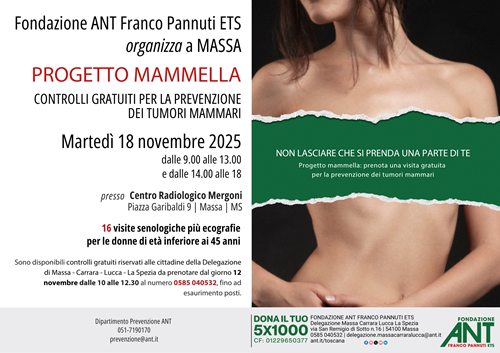 Progetto Mammella Under 45: Il giorno 18 novembre saranno disponibili 16 visite gratuite. L’esame comporta visita senologica, ecografia mammaria tutto ciò grazie all’impegno profuso dai Volontari della Delegazione di Massa-Carrara, Lucca La Spezia nell’attività di raccolta fondi e grazie a tutti i sostenitori sul territorio. Le visite nell’ambito del” Progetto Mammella ANT” per la prevenzione dei tumori della mammella saranno effettuate presso lo Studio Radiologico Mergoni, piazza Garibaldi 9/3, Massa 54100. Le prenotazioni saranno possibili dal giorno 12 novembre dalle ore 10.00 alle 12.30 fino ad esaurimento posti telefonando presso la sede ANT al numero 0585 040532Per conoscere il calendario mensile delle visite di Fondazione ANT nella nostra regione, è possibile visitare la sezione Prevenzione del sito www.ant.it/toscana. Per avere informazioni sulle attività di Fondazione ANT nelle zone di Massa, Carrara e Lucca e offrire il proprio aiuto come Volontari, è possibile contattare la Delegazione ANT di Massa della Fondazione al numero 348 3102628 o scrivere a