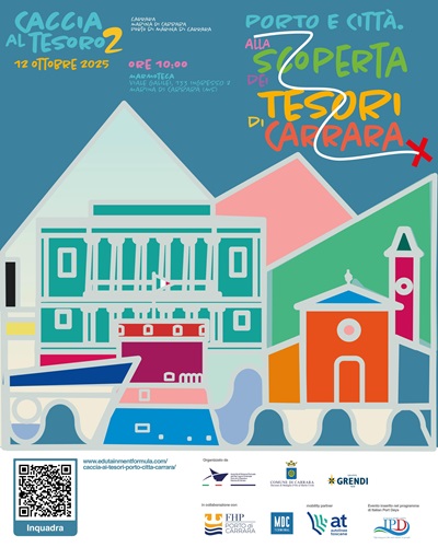 Tutto pronto per la “Caccia al Tesoro 2. Porto e città. Alla Scoperta dei tesori di Carrara” inserito nel programma di Italian Port Days, rassegna annuale promossa da Assoporti (l'Associazione dei Porti Italiani) che organizza eventi, visite e incontri nei porti italiani per aprire il mondo portuale e marittimo alla cittadinanza, promuovendo valori di inclusione, sostenibilità e consapevolezza del ruolo dei porti. L’evento è previsto per domenica 12 ottobre e si svolgerà tra Carrara, Marina di Carrara e Porto di Marina di Carrara. Tra i premi in palio: 10 ingressi per l’accesso in tribuna allo stadio della Carrarese con servizio di ospitalità; 10 buoni acquisto offerti dalla pasticceria Giuliano Torre di Avenza; 2 card da 50 euro del Buble Jungle di Marina di Carrara; bottiglie di prosecco offerte dal Bristol Lounge Caffè di Menconi Gianmaria di Marina di Carrara; 4 buoni sconto da 20% e 8 buoni sconto da 10% di Pedrini Sport, oltre ai gadgets messi a disposizione dall’Autorità di Sistema Portuale e dagli sponsor Gruppo Grendi, MDC Terminal-Gruppo Dario Perioli, Carrarese e FHP Holding Portuale (zaini, bussole, ombrelli, cappellini, ecc.).