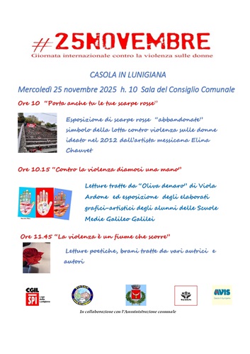 Una mattinata intensa a Casola in Lunigiana il 25 novembre Giornata internazionale contro la violenza sulle donne, dove, come di consueto, la Pro Loco organizza insieme alle associazioni del territorio -Spi Cgil della Lunigiana, Avis, CasolArte e in collaborazione con l’Amministrazione comunale- attività volte a sensibilizzare l'opinione pubblica sul contrasto alla violenza di genere e contribuire alla presa di coscienza e alla speranza di un cambiamento culturale che porti a relazioni tra i sessi rispettose e paritarie tra uomini e donne. L’evento è aperto a tutta la comunità e prevede il coinvolgimento attivo e partecipante degli alunni e delle alunne di tutte le classi delle Scuole Medie Galileo Galilei di Casola, sulla base di un rapporto di collaborazione pluriennale sulle tematiche sociali e civiche. Data la persistenza dei femminicidi e della violenza sulle donne, è infatti essenziale sensibilizzare i giovani sul rifiuto della violenza e sull’importanza di relazioni tra i sessi fondate su rispetto e dignità reciproci.