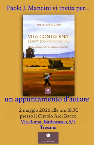 "Vita contadina e diritti economico-sociali: noia e riflessioni in un villaggio agricolo" di Paolo Jr Mancini al Circolo ARCI Bacco a Barbarasco di Tresana il 2 maggio