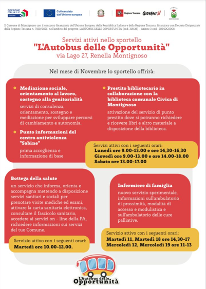 Montignoso continua a investire su una rete sociale di prossimità, concreta e vicina ai bisogni quotidiani dei cittadini. Per tutto il mese di novembre lo sportello “L’Autobus delle Opportunità”, in via Lago 27 a Renella, offrirà un ventaglio di servizi dedicati al sostegno della persona, all’inclusione, alla salute e all’orientamento ai servizi pubblici.Il progetto, realizzato in collaborazione e con il sostegno dell’Unione Europea, della Repubblica Italiana e della Regione Toscana, rappresenta un presidio territoriale sempre più importante, pensato per accompagnare i cittadini nell’accesso a servizi sanitari, sociali e amministrativi. Ogni giorno lo sportello diventa un punto di riferimento per chi ha bisogno di prenotare visite, richiedere informazioni sui servizi comunali, attivare la carta sanitaria elettronica, consultare il fascicolo sanitario, modificare la fascia economica del ticket o orientarsi tra le pratiche online della pubblica amministrazione. Oltre alla Bottega della Salute, nel mese di novembre saranno attivi anche i servizi di mediazione sociale, orientamento al lavoro e sostegno alla genitorialità; il punto informativo del centro antiviolenza Sabine; il servizio di prestito bibliotecario in collaborazione con la Biblioteca Civica di Montignoso; e il progetto infermieristico legato alla figura dell’Infermiere di Famiglia e di Comunità, un presidio territoriale dedicato alla presa in carico delle fragilità sanitarie e sociali.