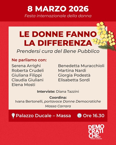 Domenica 8 Marzo a Palazzo Ducale alle ore 16.30 si terrà un incontro pubblico organizzato dalle Donne Democratiche, con il sindaco di Carrara, gli assessori dei comuni della Provincia e le segretarie Provinciale e Comunale di Massa. Donne impegnate in politica a vario titolo che marcano, con il loro impegno quotidiano, la differenza di genere. Vi invitiamo ad essere presenti perché i temi trattati, che hanno come filo conduttore la cura, abbracciano e si intrecciano con : cura dell'ambiente e politiche a sostegno, cura della città, politiche di programmazione territoriale che hanno a cuore lo sviluppo armonico di una città e tengono conto dei bisogni irrinunciabili di donne, bambini, anziani, nonchè di uno sviluppo economico compatibile e servizi sociali adeguati.