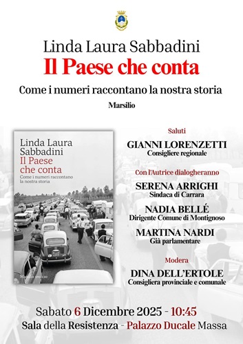 In un momento in cui la qualità del dibattito pubblico dipende sempre più dalla solidità dei dati e dalla capacità delle istituzioni di leggerli e interpretarli, le consigliere provinciali del Gruppo consiliare Centro sinistra per Massa-Carrara organizzano sabato 6 dicembre 2025, alle 10,45, nella Sala della Resistenza del Palazzo Ducale, la presentazione del libro "Il Paese che conta. Come i numeri raccontano la nostra storia" di Linda Laura Sabbadini, una delle voci più autorevoli nel Paese nell'analisi statistica e sociale.L'incontro si aprirà con i saluti del consigliere regionale del Pd Gianni Lorenzetti. A dialogare con l'autrice saranno: Serena Arrighi, sindaco di Carrara, Nadia Bellé, dirigente del Comune di Montignoso, Martina Nardi, già parlamentare del Pd. A moderare l'evento sarà Dina Dell'Ertole, consigliera provinciale e comunale del Pd.L'iniziativa rappresenta un'occasione politica e culturale di rilievo: un confronto necessario per riportare l'attenzione sulle disuguaglianze, sulle dinamiche economiche e demografiche del Paese, e sull'importanza dei numeri come strumento per orientare decisioni pubbliche fondate, trasparenti e responsabili.