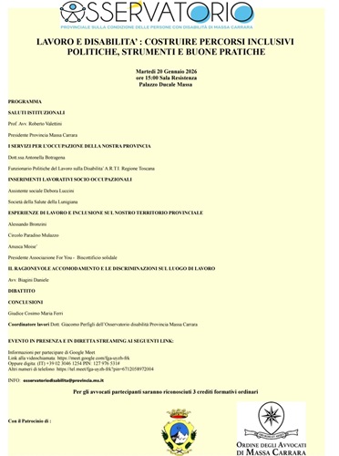 L'Osservatorio Provinciale sulla Condizione delle Persone con Disabilità di Massa Carrara organizza martedì 20 gennaio 2026, alle ore 15:00, presso la Sala della Resistenza di Palazzo Ducale a Massa, il convegno "Lavoro e disabilità: costruire percorsi inclusivi - Politiche, strumenti e buone pratiche". L'evento, che gode del patrocinio della Provincia di Massa Carrara e dell'Ordine degli Avvocati di Massa Carrara, rappresenta un'importante occasione di confronto tra istituzioni, operatori del settore e associazioni del territorio, sul tema cruciale dell'inclusione lavorativa delle persone con disabilità.Dopo i saluti istituzionali del professore avvocato Roberto Valettini, Presidente della Provincia di Massa Carrara, il programma prevede diversi interventi qualificati. La dottoressa Antonella Botragena, Funzionario Politiche del Lavoro sulla Disabilità della Regione Toscana, illustrerà i servizi per l'occupazione disponibili nella provincia. Seguiranno testimonianze di inserimenti lavorativi socio-occupazionali e esperienze concrete di lavoro e inclusione sul territorio provinciale, con gli interventi di rappresentanti del Circolo Paradiso Mulazzo, dell'Anusca Moisè e dell'Associazione For You - Biscottificio solidale.Particolare attenzione sarà dedicata al tema della tutela dei diritti, con l'intervento dell'avvocato Biagini Daniele su "Il ragionevole accomodamento e le discriminazioni sul luogo di lavoro", seguito da un dibattito. Le conclusioni saranno affidate alla Giudice, dottor Cosimo Maria Ferri.