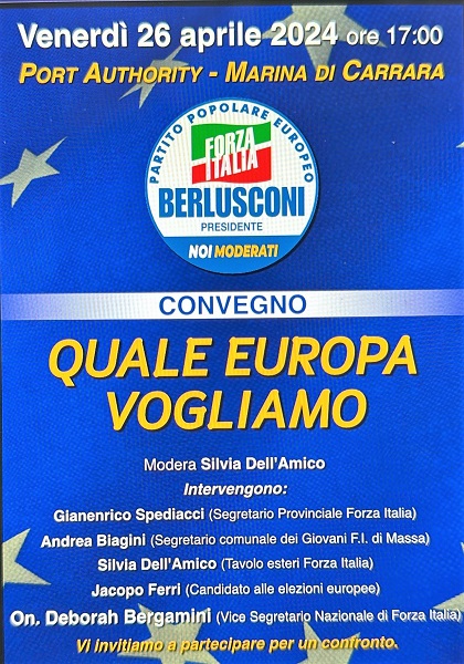 Proprio il candidato Jacopo Ferri sarà presente al convegno di venerdì e avrà modo di parlare ad ampio spettro ai presenti circa le idee che il partito ha intenzione di portare avanti in ottica futura. Seguiranno inoltre gli interventi del responsabile giovani città di Massa Andrea Biagini, che parlerà delle problematiche giovanili; e poi parlerà Silvia Dell'Amico, recentemente nominata membro del tavolo esteri nazionale di Forza Italia, portando nel convegno un contributo sull'economia europea. Il convegno sarà inoltre impreziosito dalla presenza dell'onorevole Deborah Bergamini, vicesegretario nazionale di Forza Italia e vicepresidente del Gruppo Popolare Europeo al consiglio d'Europa. "Durante il convegno toccheremo tanti temi – conclude Gianenrico Spediacci – e speriamo di poter vedere una sala gremita di persone. La cittadinanza è invitata a partecipare, perché ci sarà modo di poter avere durante l'incontro un confronto dialettico con i presenti. Riteniamo sempre utile confrontarci con le persone e questo convegno non sarà certo da meno".