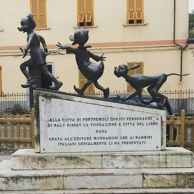 C'è un angolo della Lunigiana dove il tempo sembra essersi fermato al 1968, quando tre personaggi in bronzo hanno preso vita nei giardini pubblici di un piccolo borgo toscano. Topolino, Paperino e Pluto marciano allegramente su un basamento di pietra, immortalati in una delle sculture pubbliche più curiose e meno conosciute d'Italia: forse l'unico monumento del nostro Paese dedicato ai personaggi Disney. Un'opera che racconta l'incontro tra l'editoria e la cultura popolare, un momento storico in cui i fumetti stavano diventando letteratura per tutti.La storia di questa statua affonda le radici nel rapporto profondo tra Pontremoli e il mondo dei libri. Non è un caso che l'opera si trovi proprio qui: dal 1953, questo borgo medievale di poco più di 7.000 abitanti ospita il prestigioso Premio Bancarella, uno dei riconoscimenti letterari più antichi d'Italia, che gli è valso il titolo di "Città del Libro". Un luogo dove la carta stampata non è solo cultura, ma identità. Ed è proprio come ringraziamento alla casa editrice Mondadori che nel 1968 venne eretta questa scultura. Arnoldo Mondadori, il grande editore milanese, aveva infatti stretto nel 1935 un accordo storico con Walt Disney per pubblicare in Italia le avventure del topo più famoso del mondo. Da quel momento, "Topolino" divenne molto più di un semplice fumetto: fu letteratura per ragazzi, compagno di generazioni, fenomeno culturale di massa. Si racconta che Mondadori stesso fosse talmente legato al personaggio da controllare personalmente le bozze del giornalino ogni sera, prima di andare a dormire. Un'attenzione maniacale che trasformò Topolino in un'icona italiana, tanto che ancora oggi, a distanza di quasi novant'anni, resta uno dei settimanali più venduti nel nostro Paese.