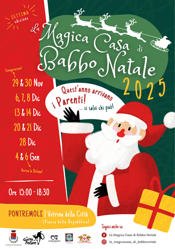 Attenzione! Si avvisano i gentili visitatori che quest’anno, alla Magica Casa di Babbo Natale di Pontremoli, potranno trovare molto più caos del solito! Ebbene sì, pare proprio che Babbo Natale abbia deciso di rendere le feste ancora più movimentate invitando a casa sua tutta (ma proprio tutta) la Famiglia Claus. Ancora una volta, il vecchietto più amato del mondo non manca l’appuntamento con Pontremoli, ma questa volta arriverà in grande stile, circondato dai suoi parenti più stravaganti e chiassosi. Insieme trasformeranno la sua dimora in un luogo pieno di risate, sorprese e piccole, adorabili disavventure.Dal 29 novembre 2025 la Magica Casa di Babbo Natale apre le sue porte con la settima edizione. Tra i corridoi dell’incantevole dimora sarà possibile incontrare la puntigliosa cugina Gelinda Claus, inflessibile responsabile della sicurezza e custode della famosa lista dei buoni e dei cattivi o la frizzante Reginalda Natalia Claus, figlia di Babbo Natale ed ereditiera del suo impero natalizio. I più curiosi potranno visitare la cantina di Brinda Claus (cugina alla lontana, ci tiene a precisare Babbo) dove nascono i suoi vini più pregiati e la pasticceria coloratissima della nipote Pandora Claus, cuoca provetta che ha brevettato tutte le ricette natalizie più famose. E guai a non passare dall’ufficio postale di Francabolla Claus, caotico ma efficientissimo, per consegnare la propria letterina. Infine, non può dirsi una visita a Casa Klaus come si deve senza aver ascoltato almeno una storia di Nonna Newanda, detta “Nonna Natale”, così anziana da ricordare il primo inverno della storia.E naturalmente, non mancherà Babbo Natale in persona, pronto ad accogliere grandi e piccini con il sorriso per ascoltare i loro desideri.Ad accompagnare l’apertura della Magica Casa di Babbo Natale 2025, non mancheranno poi divertenti attività e laboratori per bambini, i deliziosi mercatini natalizi, le passeggiate sui pony organizzate dal Country Pony Club, spettacoli e l’immancabile Trenino Lillipuziano.La Vetrina della Città, i suggestivi sotterranei medievali del comune di Pontremoli, accolgono anche quest’anno l’evento, la cui inaugurazione è prevista per il 29 novembre alle ore 15.00. La Magica Casa rimarrà visitabile per tutto il periodo natalizio dalle ore 15.00 alle ore 18.30 nelle giornate del 29 e 30 novembre, 6, 7, 13, 14, 20, 21, 28 dicembre e 4 e 6 gennaio 2026.Come le edizioni precedenti, la Magica Casa di Babbo Natale del Comune di Pontremoli è allestita e curata dal gruppo “Le Gatte da pelare” con la preziosa collaborazione del Centro Giovanile “Mons. G. Sismondo”, Pro Loco Pontremoli, Country Pony Club, Animante e Compagnia del Piagnaro.Nell’attesa di incontrarci presto in compagnia di Babbo Natale e della sua famiglia, vi invitiamo a seguire La Magica Casa di Babbo Natale su Instagram (la_magicacasa_di_babbonatale) e Facebook (La Magica Casa di Babbo Natale) per rimanere sempre aggiornati su tutte le novità.