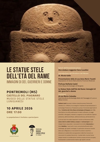 Un nuovo incontro attende gli appassionati di archeologia e di storia antica al Castello del Piagnaro di Pontremoli, venerdì 10 aprile alle ore 17.00, con ingresso libero. La conferenza, dal titolo: "Le statue Stele dell'età del rame- Immagini di dei, guerrieri e donne", organizzata nell'ambito delle attività di valorizzazione del Museo delle Statue Stele Lunigianesi, sarà un'occasione unica per approfondire uno dei capitoli più suggestivi dell'archeologia preistorica italiana: le Statue Stele della Lunigiana, enigmatiche sculture antropomorfe realizzate in arenaria tra l'età del Rame e l'età del Ferro.Primi testimoni delle comunità che abitarono la Valle del Magra e i territori circostanti – da Pontremoli a Filattiera, da Fivizzano fino ai confini della Lunigiana – le statue stele rappresentano figure maschili e femminili, arricchite da armi, ornamenti e simboli che ancora oggi affascinano studiosi e visitatori. L'incontro sarà aperto dai saluti dell'Amministrazione comunale, affidati alla Vice Sindaco reggente Clara Cavellini, e dall'introduzione del direttore del Museo delle Statue Stele Lunigianesi, Dottor Nicola Gallo.