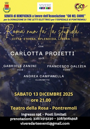 Il periodo natalizio è alle porte e come ogni anno non poteva mancare al Teatro della Rosa il consueto appuntamento che unisce il piacere della buona musica e la beneficenza. Gabriele Zanini torna ospite a Pontremoli in una serata organizzata dall’Associazione “Vivere d’arte Eventi” in collaborazione con il Comune di Pontremoli e con “Cio nel cuore Aps”, dal titolo “Roma nun fa’ la stupida…- Città eterna, splendida, libera”. Ospite d’onore della serata la figlia dell’indimenticato Gigi Proietti, Carlotta Proietti, che insieme alla splendida voce di Gabriele Zanini e all’accompagnamento del Maestro Francesco Galizia al piano e Andrea Campanella al clarinetto, permetteranno a tutti i presenti un’immersione a tutto tondo nelle più belle canzoni che raccontano Roma in tutti i suoi aspetti più belli e caratteristici.