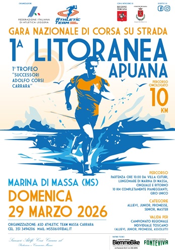 Marina di Massa si prepara a ospitare un appuntamento di primo piano dell’atletica italiana. Domenica 29 marzo 2026, con partenza alle ore 10 da Villa Cuturi, andrà in scena la Litoranea Apuana – 1º Trofeo “Successori Adolfo Corsi Carrara”, gara nazionale FIDAL di corsa su strada su percorso omologato di 10 chilometri.L’evento è organizzato da Athletic Team Massa Carrara insieme alla Federazione Italiana di Atletica Leggera, con il patrocinio di Regione Toscana e Comune di Massa. Il tracciato, interamente pianeggiante, si sviluppa sul lungomare tra Marina di Massa e Cinquale:un percorso lineare, veloce e ideale per chi punta a migliorare il proprio tempo. Una cornice suggestiva e perfetta per i tanti runner che preferiscono la strada alla montagna, dopo che, nell’estate 2024, la società aveva organizzato il prestigioso Campionato Regionale Assoluto di Corsa in Montagna.Per Athletic Team Massa Carrara, giovane associazione affiliata FIDAL è nata appena due anni fa, si tratta di un nuovo riconoscimento importante. La società sta crescendo a ritmo esponenziale, sia nel numero degli atleti sia nella qualità della proposta tecnica. In soli due anni ha già firmato tre eventi di rilievo: il Campionato Interprovinciale Cadetti 2024, il già citato Campionato di Corsa in Montagna e ora questa nuova gara nazionale su strada. Un percorso che conferma la fiducia riposta dalla Federazione nella sua capacità organizzativa.Le iscrizioni resteranno aperte fino al 27 marzo. Dal giorno successivo saranno pubblicate le liste ufficiali degli iscritti e le eventuali variazioni di orario. La gara è aperta alle categorie Allievi, Junior, Promesse, Senior e Master ed è valida per il Campionato Regionale Individuale Toscano.Le premiazioni, previste a partire dalle ore 11:00, vedranno i delegati FIDAL consegnare ai vincitori di categoria coppe realizzate appositamente per l’evento, con una grafica esclusiva. Saranno premiati sia gli atleti individuali sia le società. Il presidente di Athletic Team Massa Carrara, professor Vincenzo Genovese, esprime grande soddisfazione per questo nuovo traguardo: