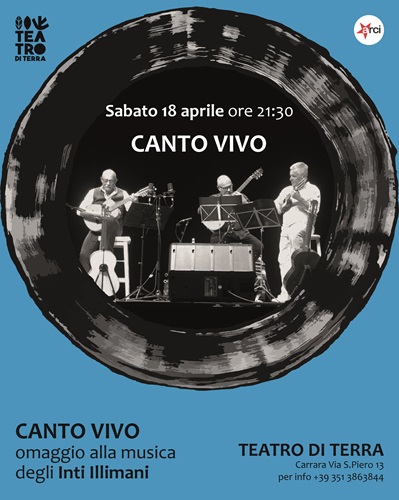 Sabato sera Teatro di Terra propone un viaggio nella tradizione musicale latinoamericana con il gruppo "Canto Vivo – Amigos historicos" composto dai tre polistrumentisti Stefano Macrillò, Nicola Pieruccetti e Marcello Forconi. Una passione che risale agli anni Settanta, quando in Cile e in altri paesi dell'America Latina la democrazia veniva stroncata da colpi di stato finanziati dagli Stati Uniti e i canti di lotta e di speranza del popolo cileno si levavano potenti nelle piazze e nelle università. Da allora la passione di Stefano, Nicola e Marcello per la Nueva Canciòn Chilena non è mai venuta meno, la stessa passione che ha spinto questi tre amigos ad approfondire negli anni i vari strumenti della tradizione latinoamericana. Canto Vivo è un tributo ai grandi interpreti di quella grande stagione di musica e di lotte popolari - Inti Illimani, Victor Jara, Mercedes Sosa, Violeta Parra, Quilapayun - con molto amore e creatività.Tra i prossimi appuntamenti al Teatro di Terra anche spettacoli teatrali: il 24 aprile Estate '44 della compagnia Ultimo Teatro, giovedi 30 Se questo è un operaio della compagnia Attrice Contro, il 2 maggio Accabadora tratto del testo di Michela Murgia e l'8 maggio il reading poetico Mi dispiace per le hostess. Poesie d'amore ad alta quota con Patrizio Bellolli e Francesco d'Amore. Inoltre il 3 maggio, in occasione del mercatino degli scambi su tutta via San Piero "La Baccarella", verrà presentato Circo in Famiglia, un laboratorio di circo per genitori e bambini/e con le insegnanti del Circo Galleggiante (iscrizioni entro 30 aprile!).