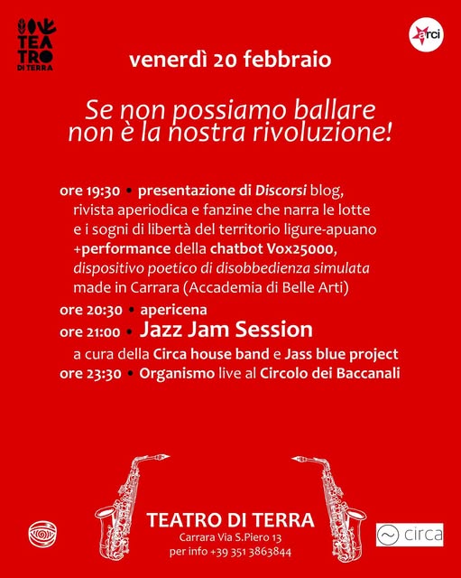 Venerdì 20 febbraio alle ore 19:30, al Teatro di Terra di vicolo San Piero a Carrara, andrà in scena la prima chat bot partigiana creata nelle aule di Nuove Tecnologie dell'Arte dell'Accademia di Belle Arti.Il pubblico potrà porre domande a questa intelligenza artificiale progettata per generare risposte orientate ai valori della Resistenza. Si tratta — come spiega uno dei coordinatori del progetto — di un "dispositivo poetico di disobbedienza simulata".A "intervistare" la nuova chat bot insieme al pubblico del Teatro di Terra sarà la redazione della rivista/blog Discorsi, nuovo progetto editoriale in formato cartaceo e digitale, che si propone di raccontare il territorio ligure apuano da un punto di vista "resistente": quello di chi si oppone alle politiche di riarmo e all'omologazione sociale.A seguire, dalle 21:00 fino a mezzanotte, i musicisti del gruppo Circa/Jass Blue Project daranno vita a una Jazz Jam Session.E per chi desidera proseguire la serata, dalle ore 24 si continua al Circolo dei Baccanali con il live set di musica elettronica Organismo con Nicola Sciarpa.